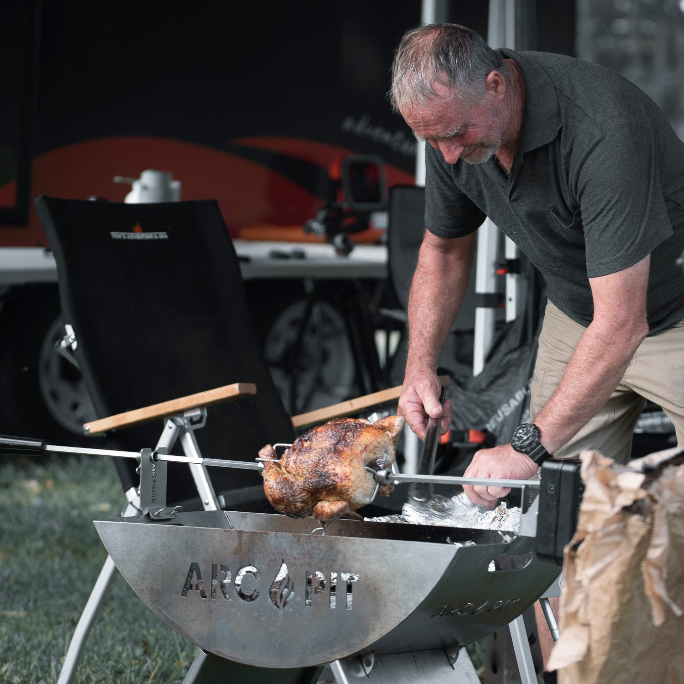 Designed for real campfire meals, the ArcPit supports BBQ plates, grills and rotisserie cooking so you can cook proper dinners at camp — not just toast marshmallows.