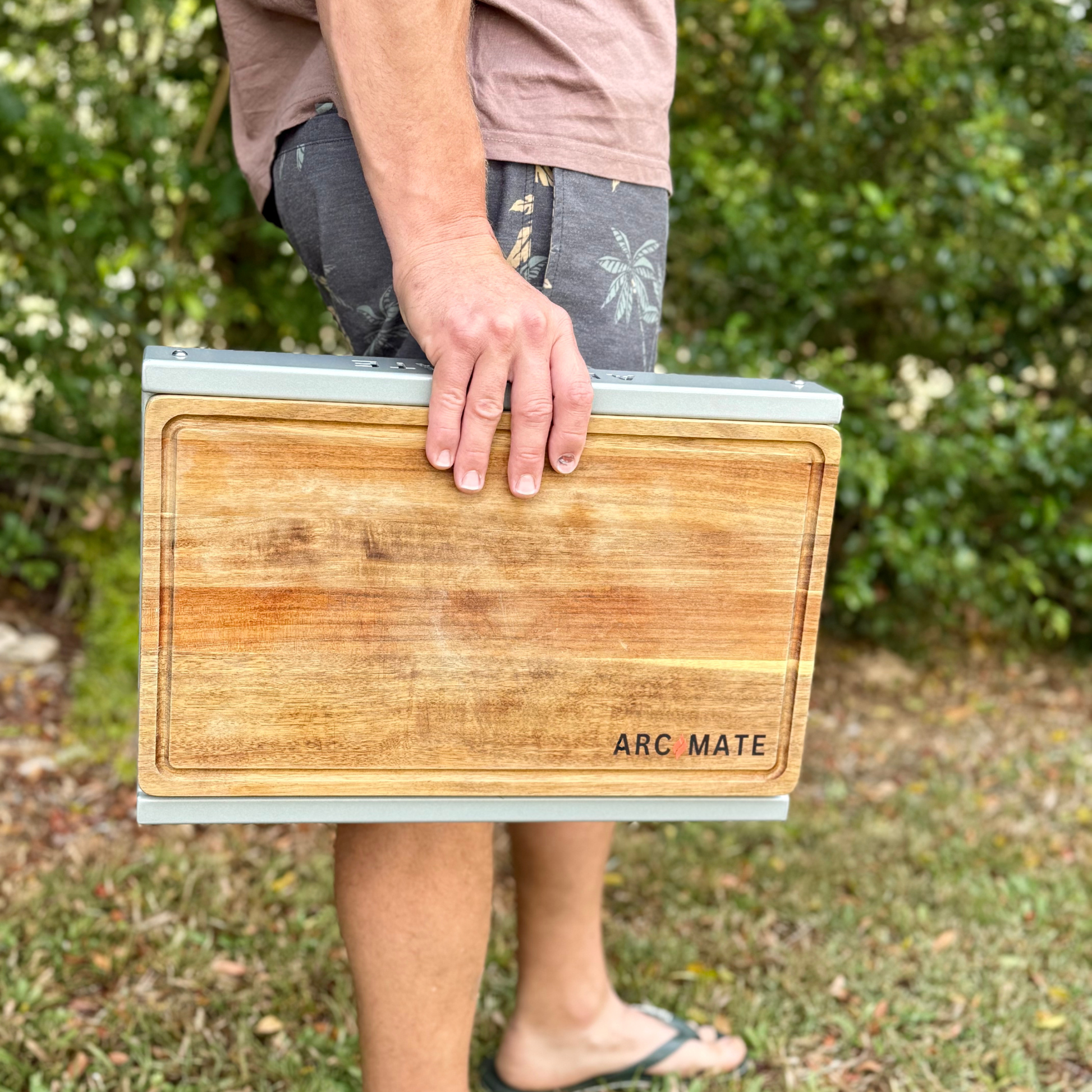 Lightweight aluminium, reversible acacia board, quick-fold gas-strut legs to give you a stable, portable surface for chopping, prepping, or serving — all packed in a durable canvas bag.